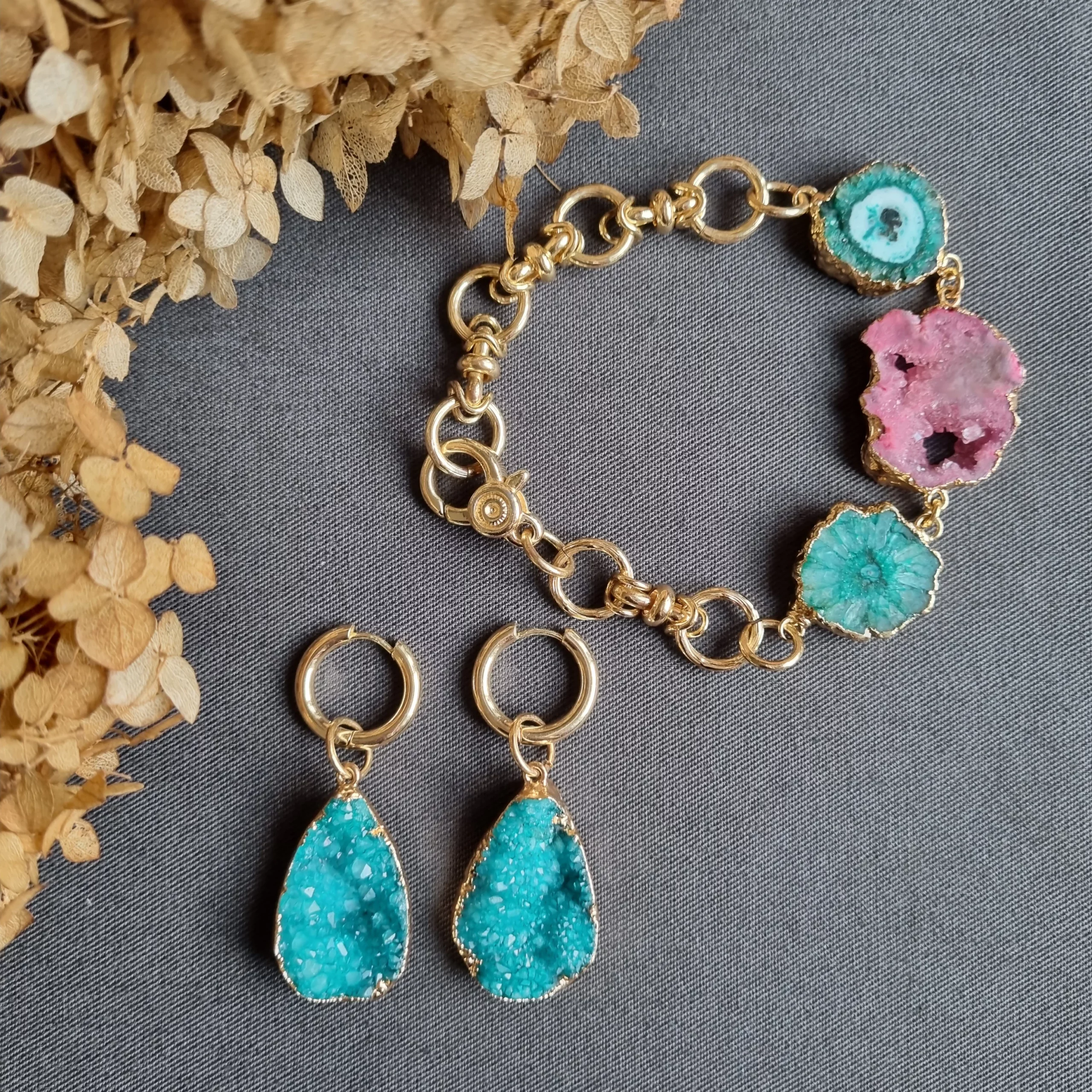 Браслет-цепь с друзами сахарного кварца изумрудного и розового цветов.