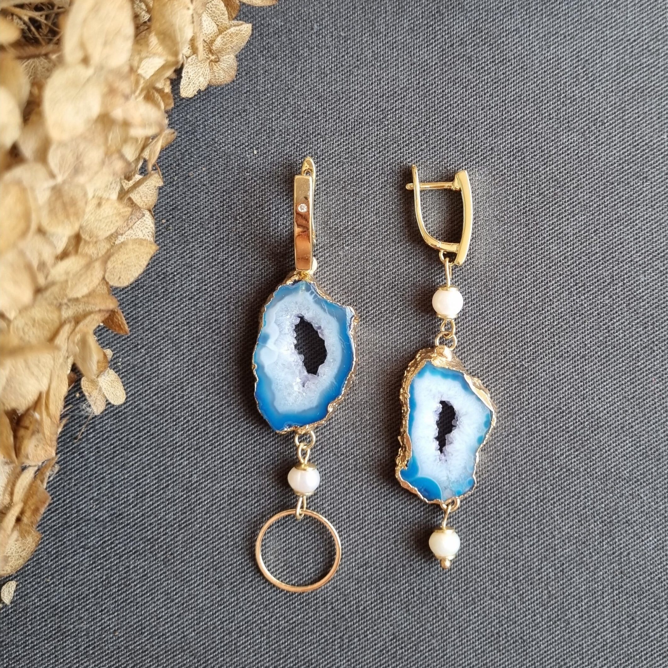 Серьги с друзами агата сине-белого цвета с добавлением натурального белого речного жемчуга. Английский замок. Средняя длина. Ассиметричный дизайн.