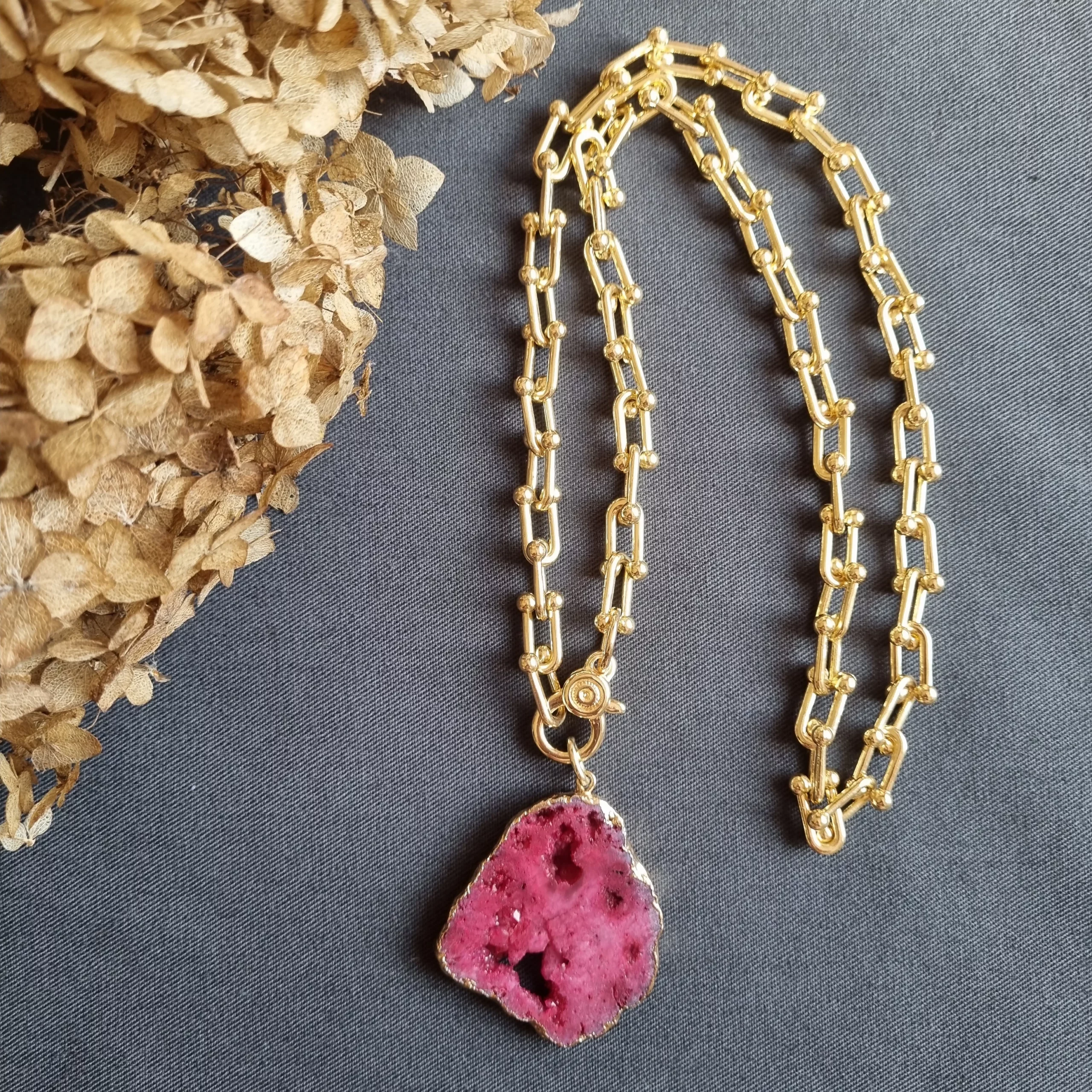 Цепь сложного плетения с подвеской из друзы сахарного кварца красного цвета идеальна для яркого акцента!