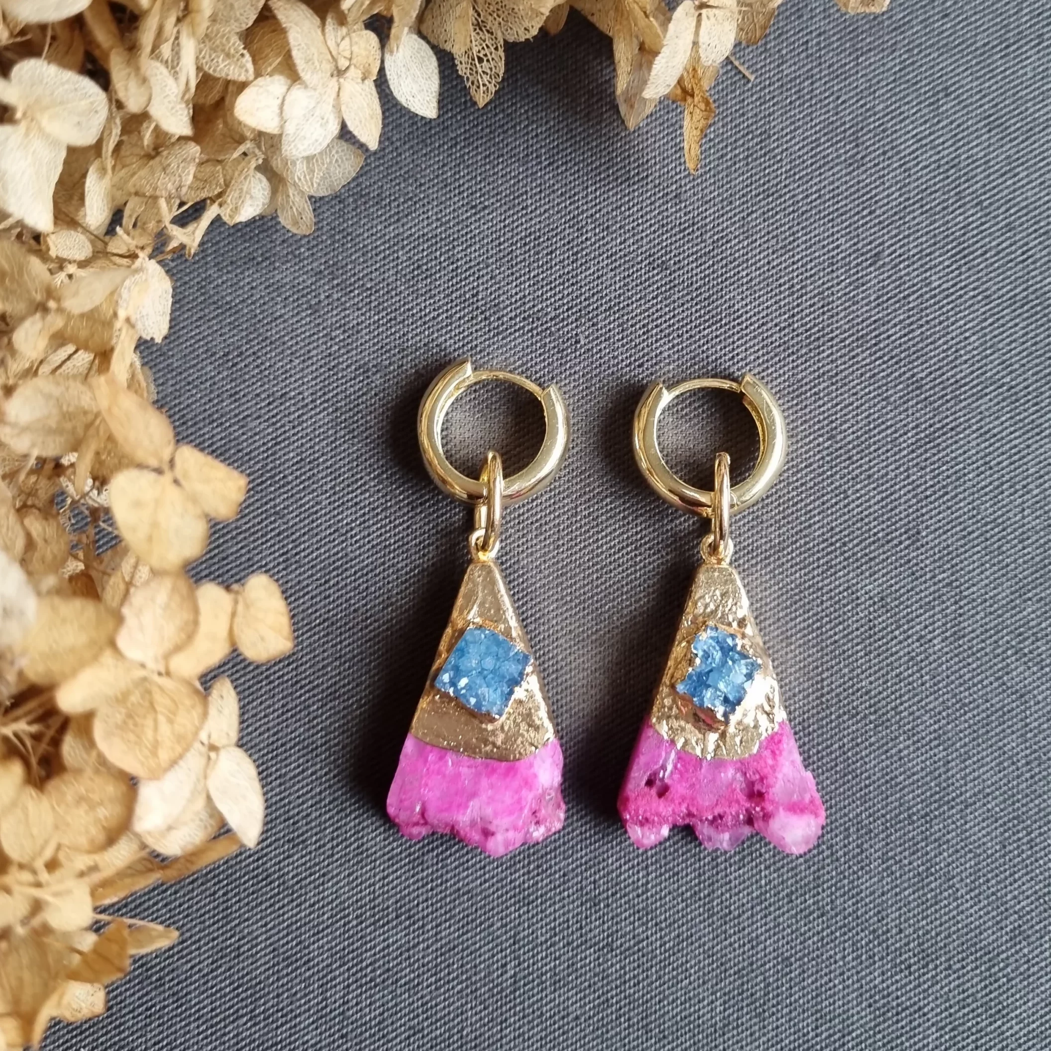 Идеальный вариант — серьги конго с друзами сахарного кварца цвета фуксия с добавлением синего агата в патине!