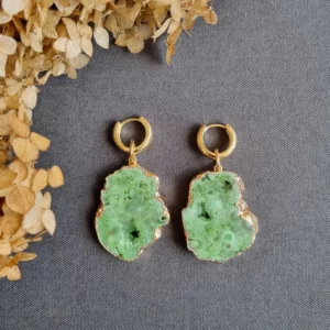 Серьги конго с друзами сахарного кварца нежно-розового цвета с добавлением зеленого агата в патине.
