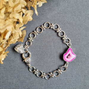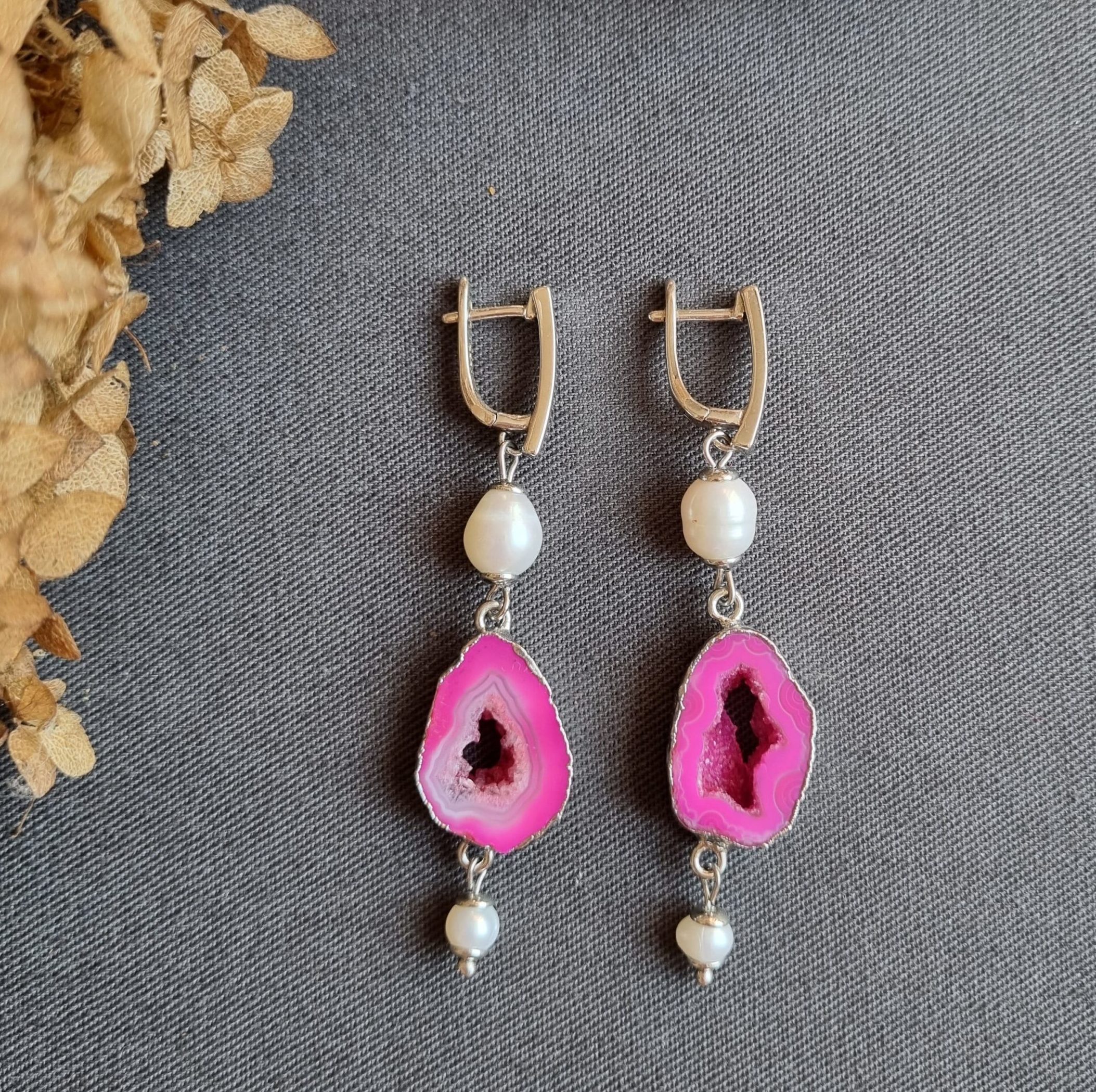 Серьги ассиметричного дизайна с друзами агата цвета фуксия с добавлением натурального белого речного и барочного жемчуга! Английский замок, средней длины.