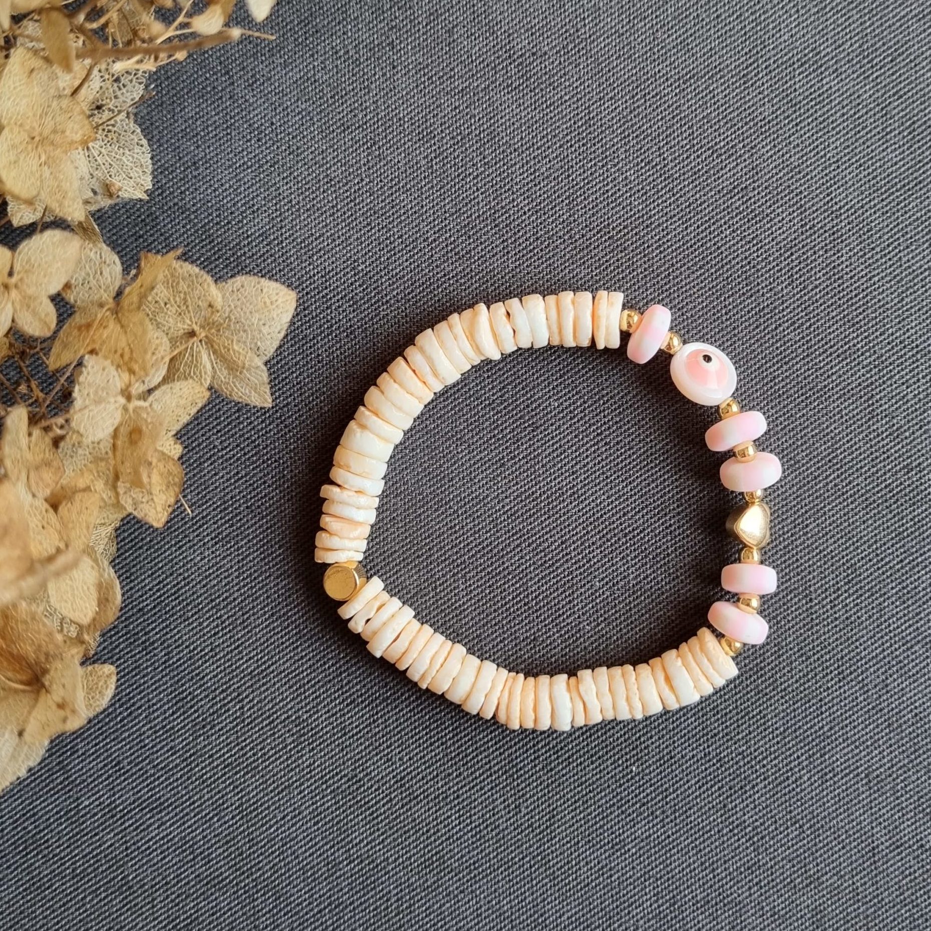 Браслет из ракушечника кремового цвета с бусинами нежно-розового оттенка. Легкий и нежный, прекрасный вариант на каждый день!