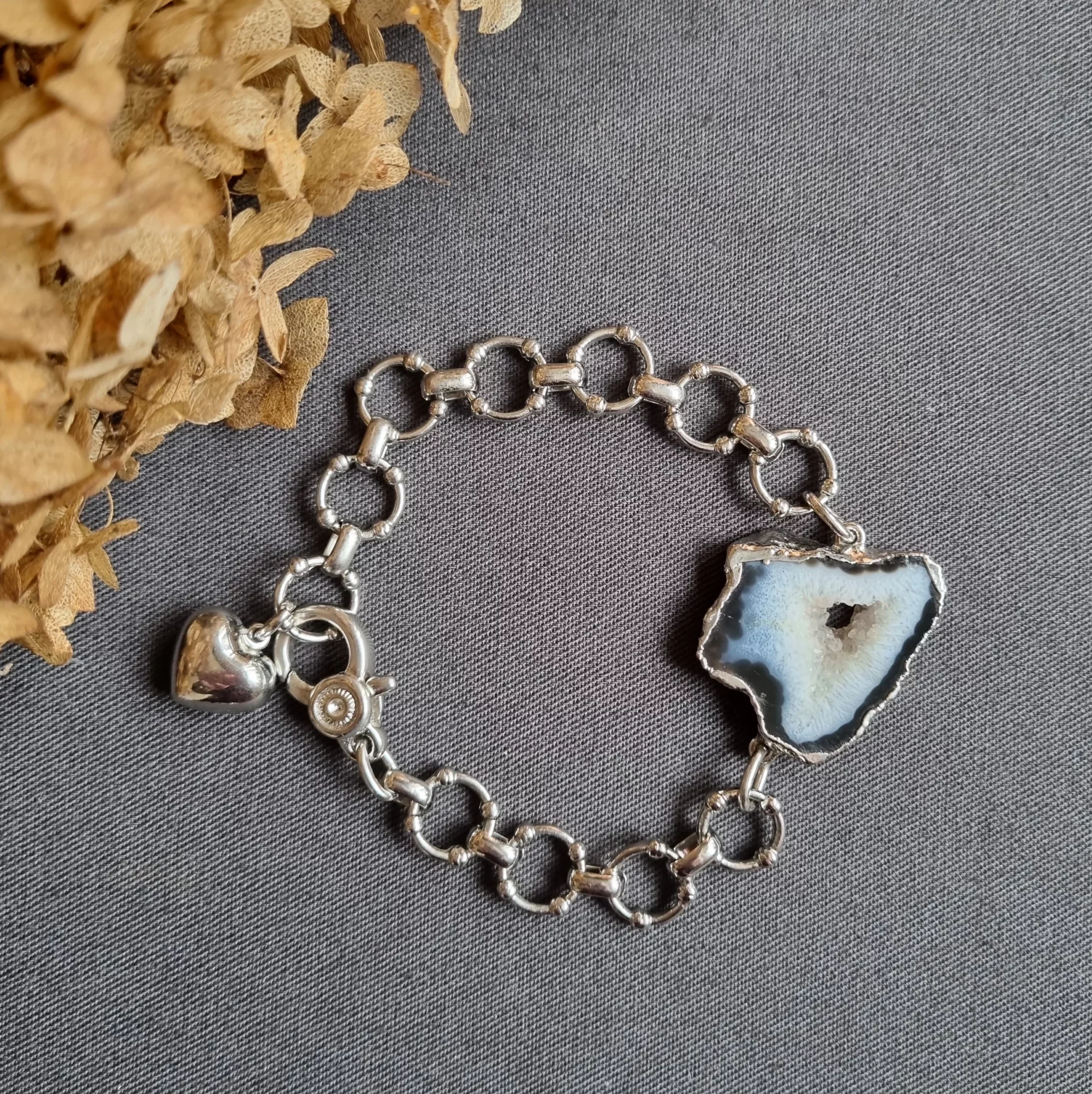 Браслет — цепь с крупной друзой натурального агата черного цвета с подвеской в виде объемного сердца!