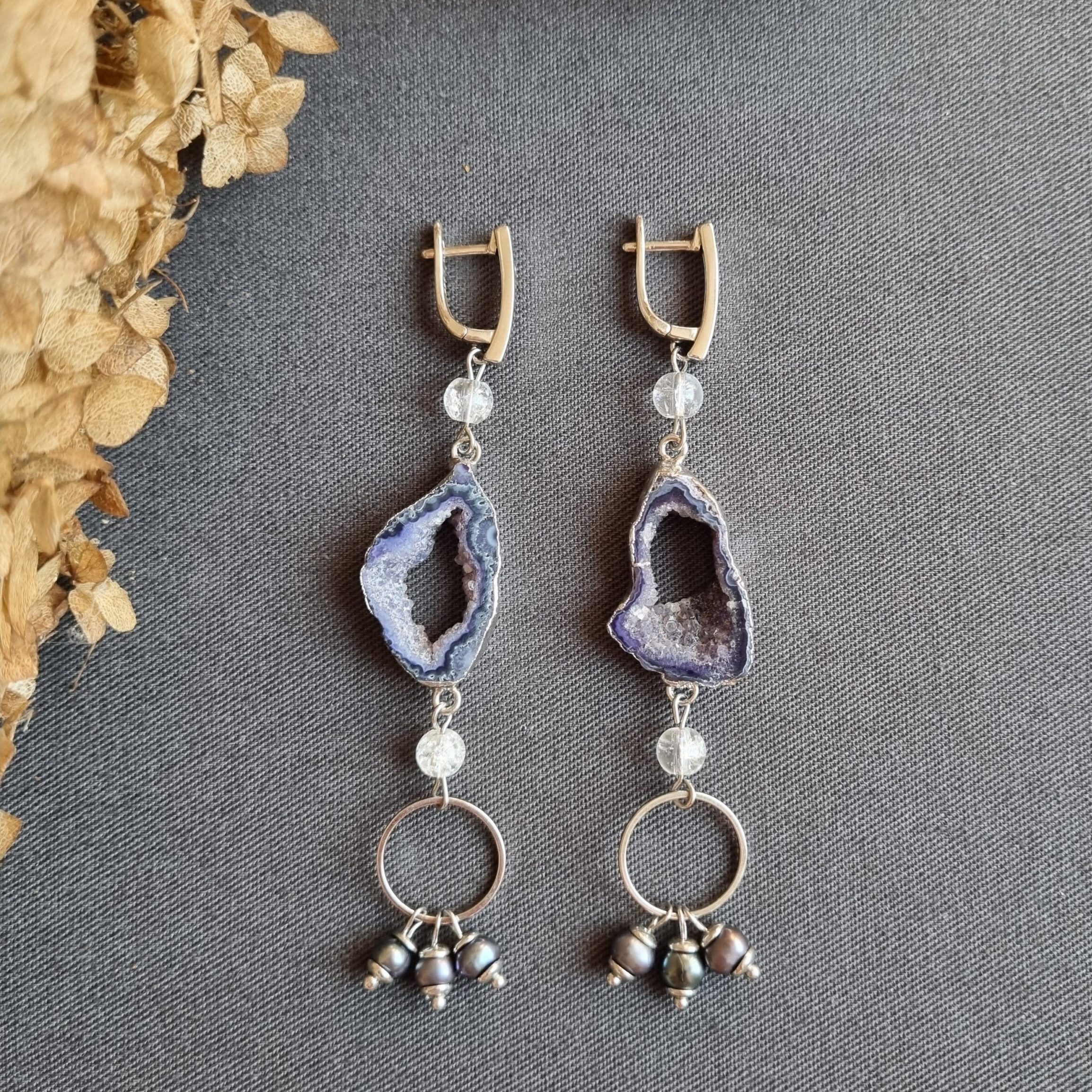 Серьги длинные с друзами натурального агата фиолетового цвета с подвесками из натурального черного жемчуга и сахарного кварца!