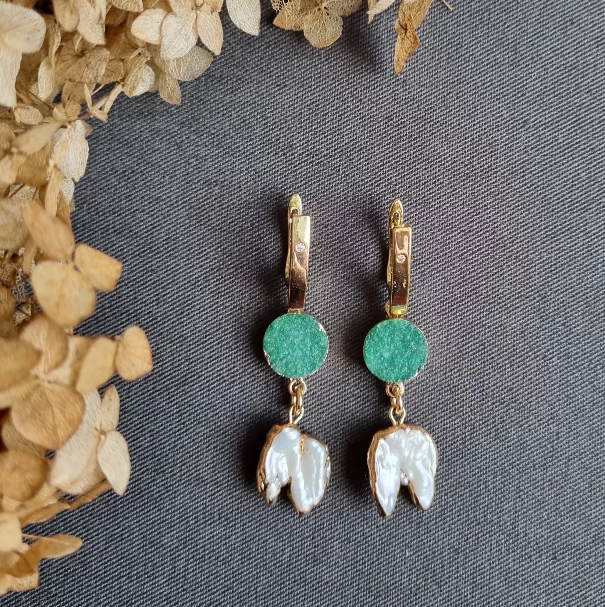 Серьги с друзами сахарного кварца зеленого цвета и друзами натурального белого жемчуга в патине.