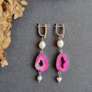 Серьги с друзами агата розового цвета с добавлением  натурального белого речного жемчуга покоряют с первого взгляда и привлекают внимание!