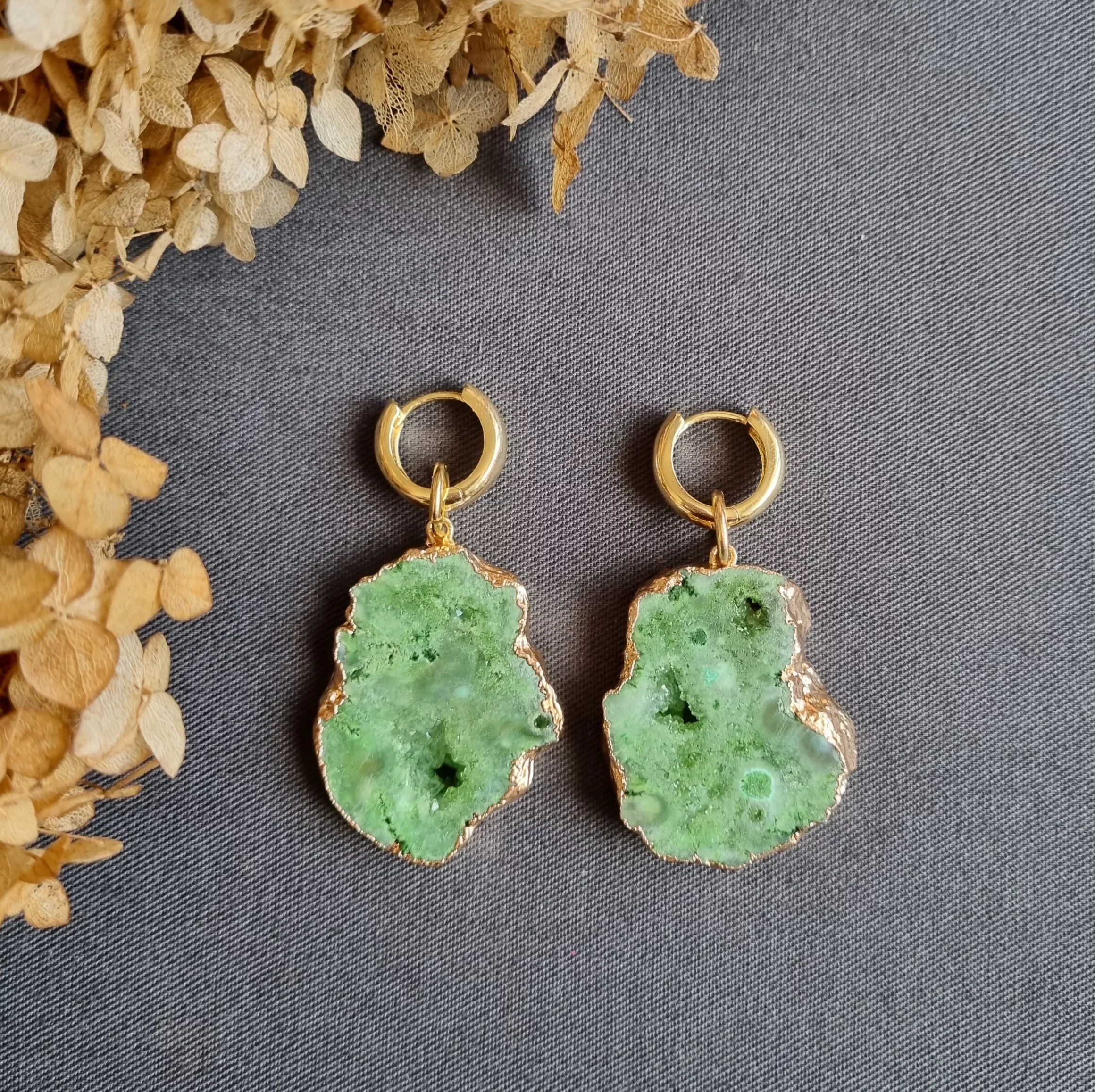 Серьги с друзами сахарного кварца зеленого цвета, крупные, серьги — конго. Материал — гипоаллергенное покрытие золото(родий), ручная работа.
