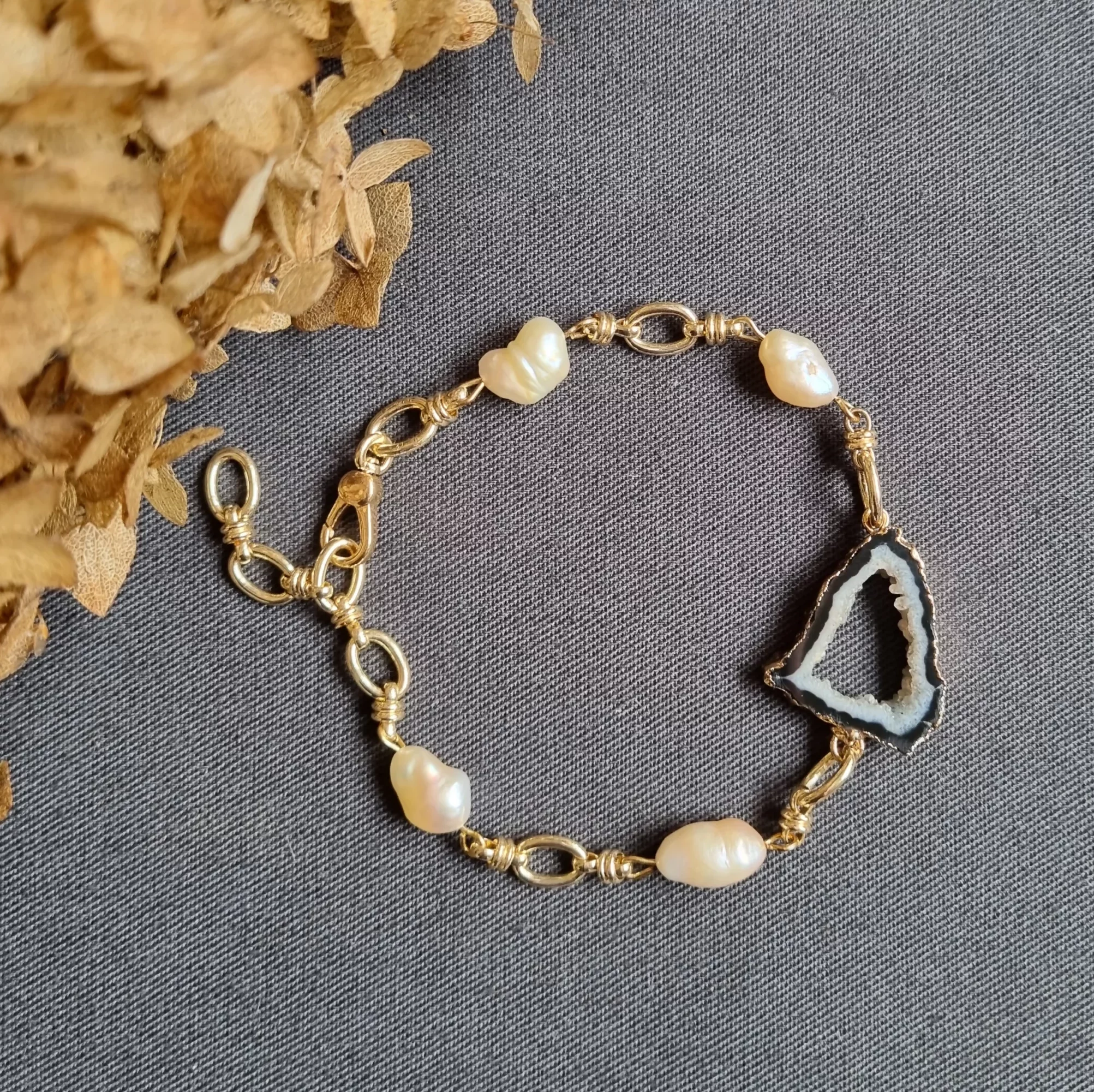 Изысканный и утонченный браслет — цепь с друзой агата чёрного цвета и желтым, барочным жемчугом, регулируемая по длине застёжка карабин, материал гипоаллергенное покрытие золото (родий).