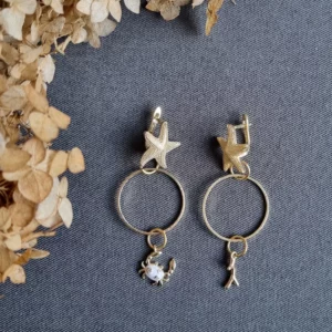 Серьги конго с подвесками из белого морского жемчуга и золотыми звездами. Сверхлегкие, средней длины. Материал — гипоаллергенное покрытие золото(родий).