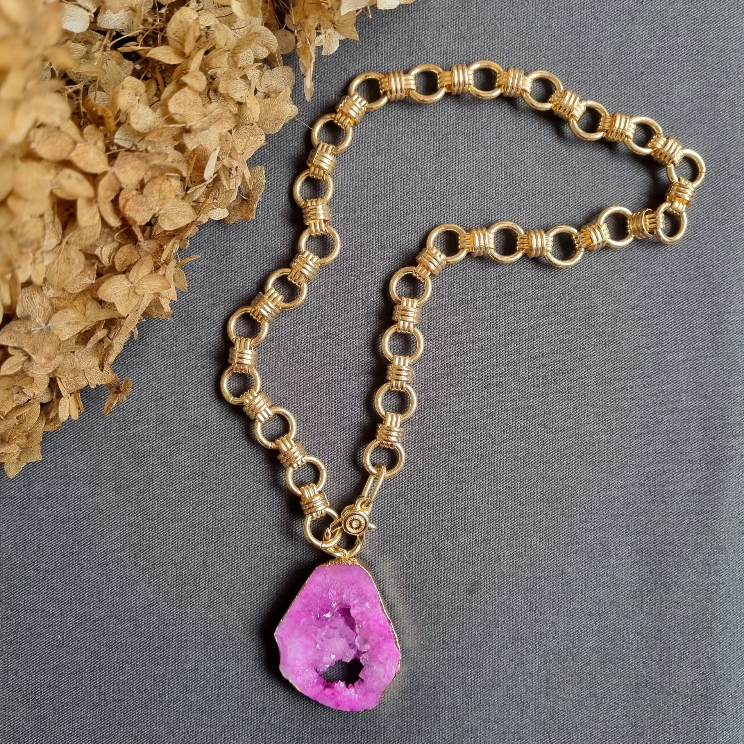Ультрасовременное колье-цепь с крупным плетением в самом актуальном цвете сезона сделает ваш образ неотразимым! Подвеска в виде крупной капли из друзы сахарного кварца, застёжка регулируемый карабин, возможность смены кулонов.