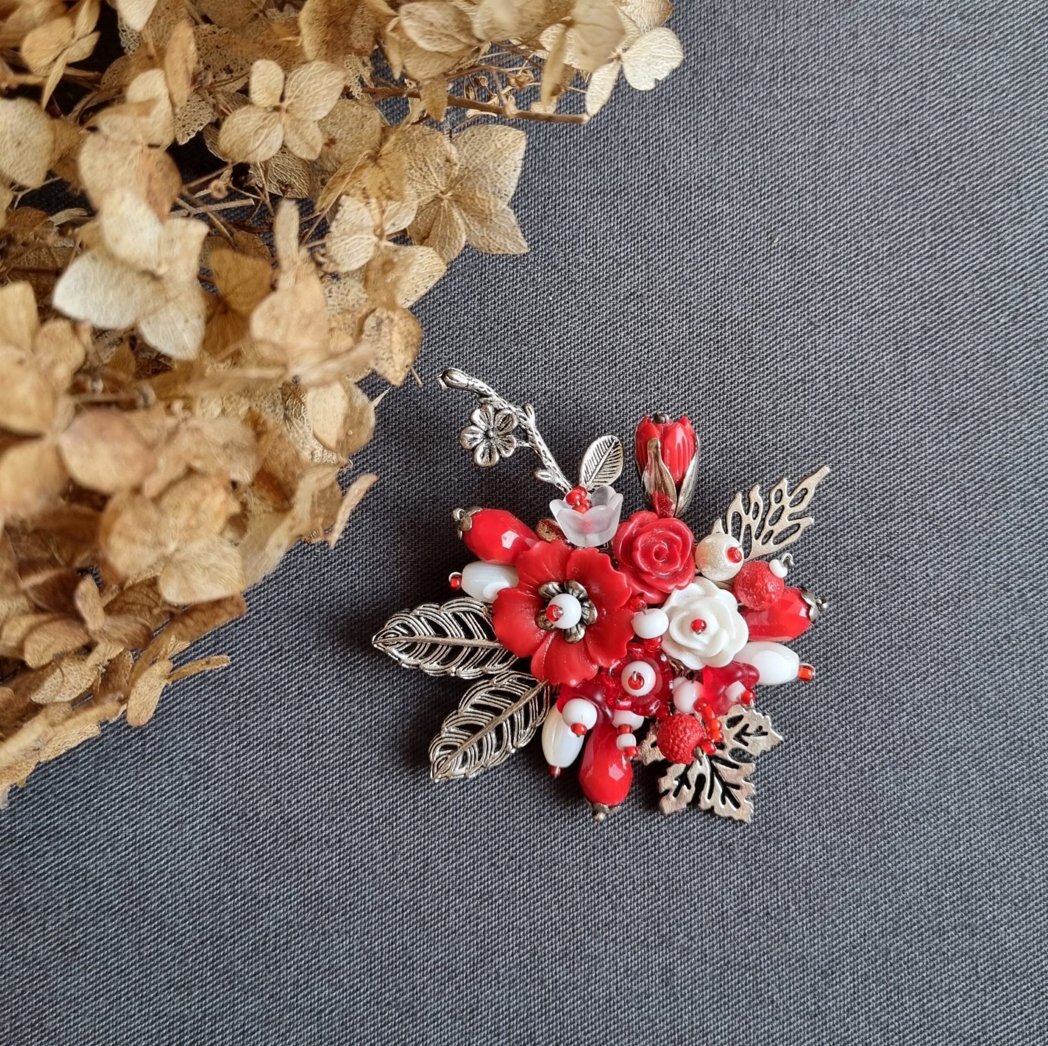 Брошь в виде букета из керамических роз красного цвета с листьями и металлическим декором.