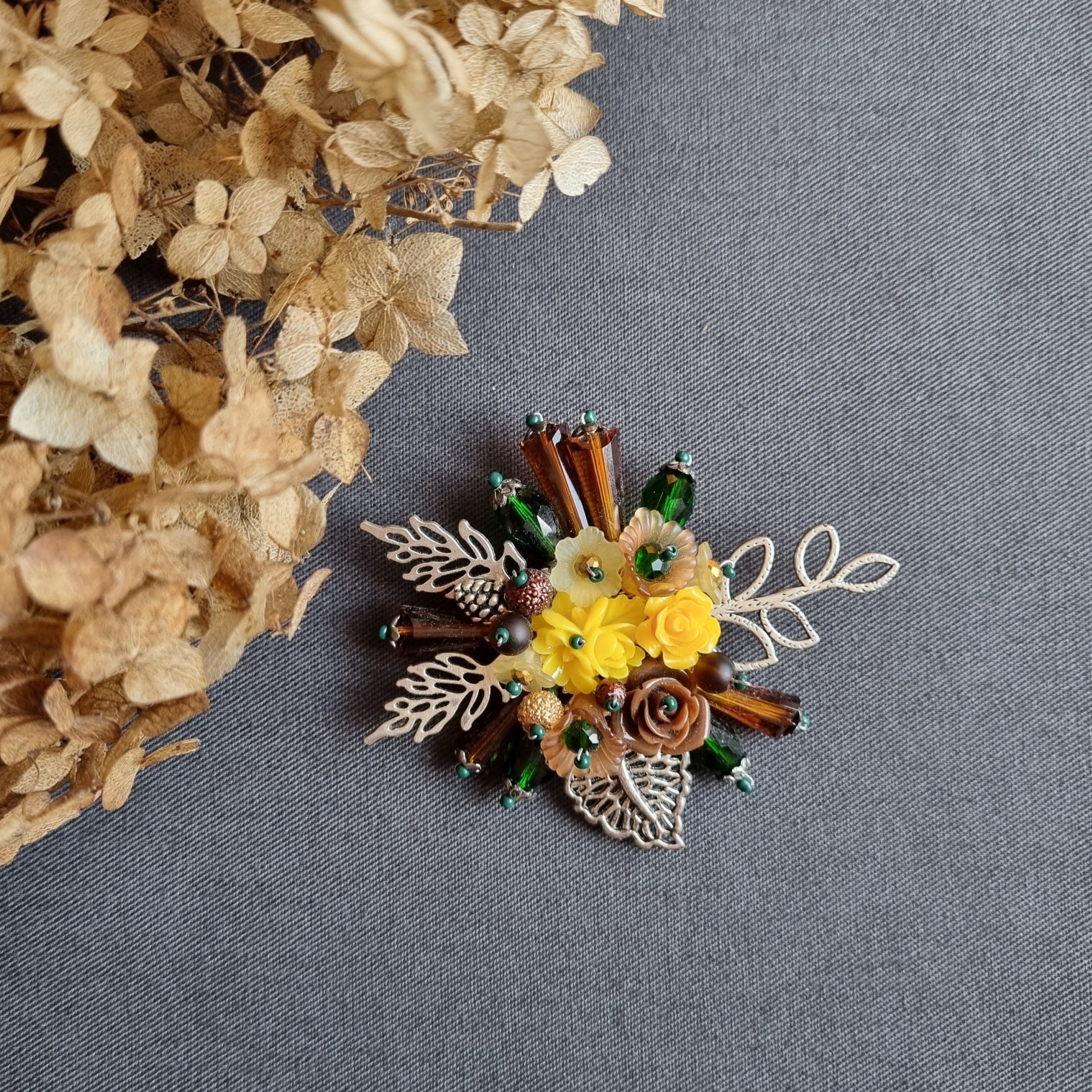Брошь в виде букета из керамических роз коричневого и желтого цветов с листьями и металлическим декором.