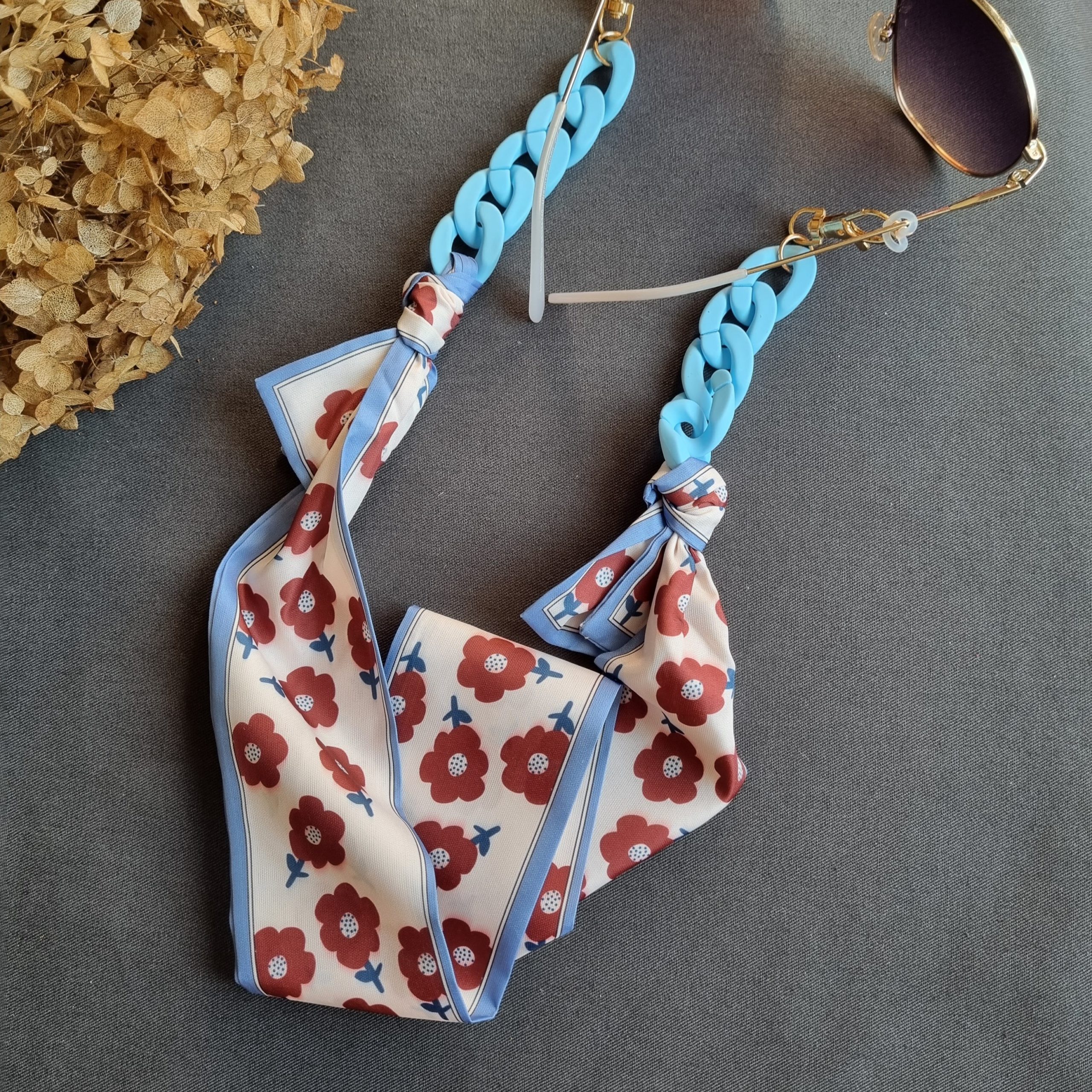 Держатель для очков из шелка в оригинальных цветочных мотивах с голубой пластиковой цепью — стильный летний аксессуар, который не оставит равнодушной!