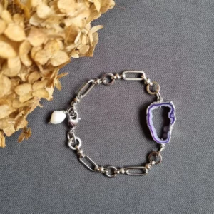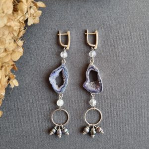 Серьги длинные с друзами натурального агата сиреневого цвета. Подвески из натурального белого речного жемчуга.