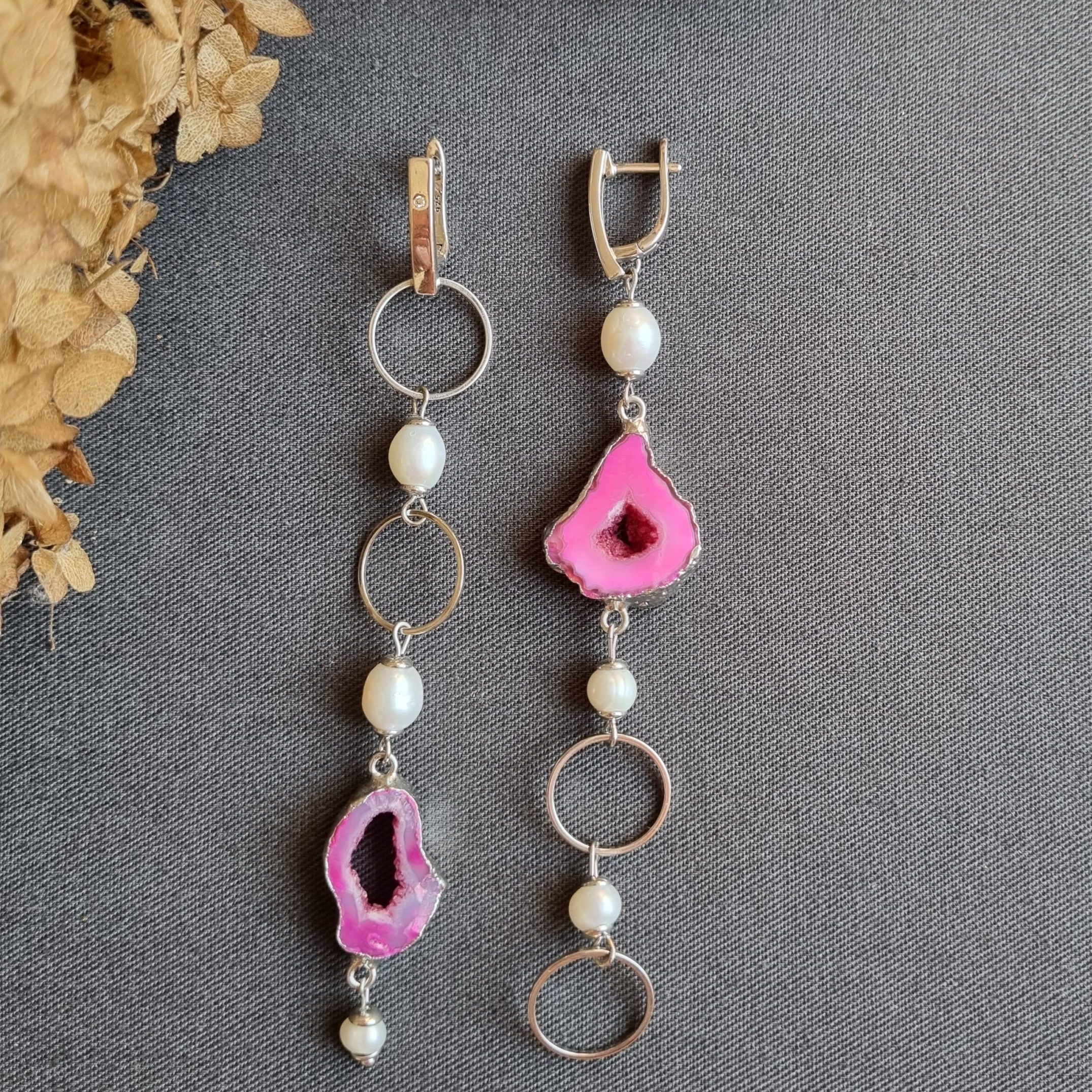 Серьги длинные ассиметричного дизайна с друзами агата розового цвета и белым жемчугом, ручная работа.