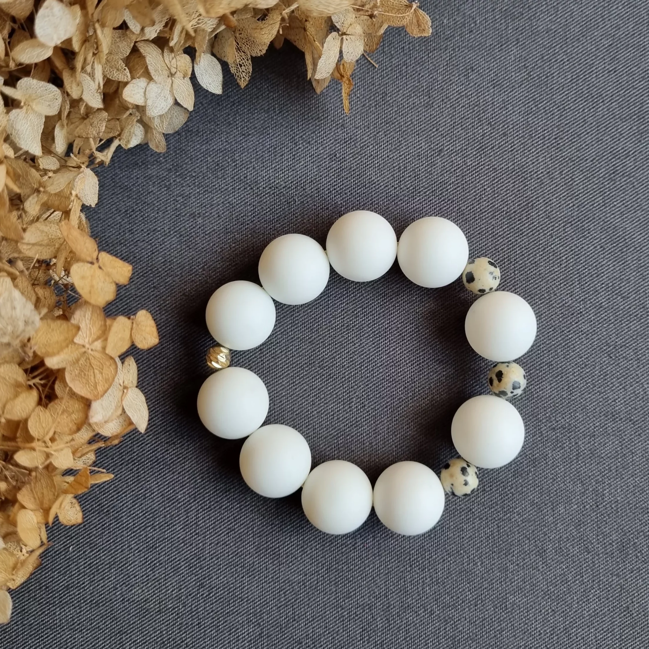 Идеально подойдет браслет «Белый агат». Элегантность, четкость линий и минимализм. Стрейч дизайн, ручная работа, бусины белого агата и яшма далматин.
