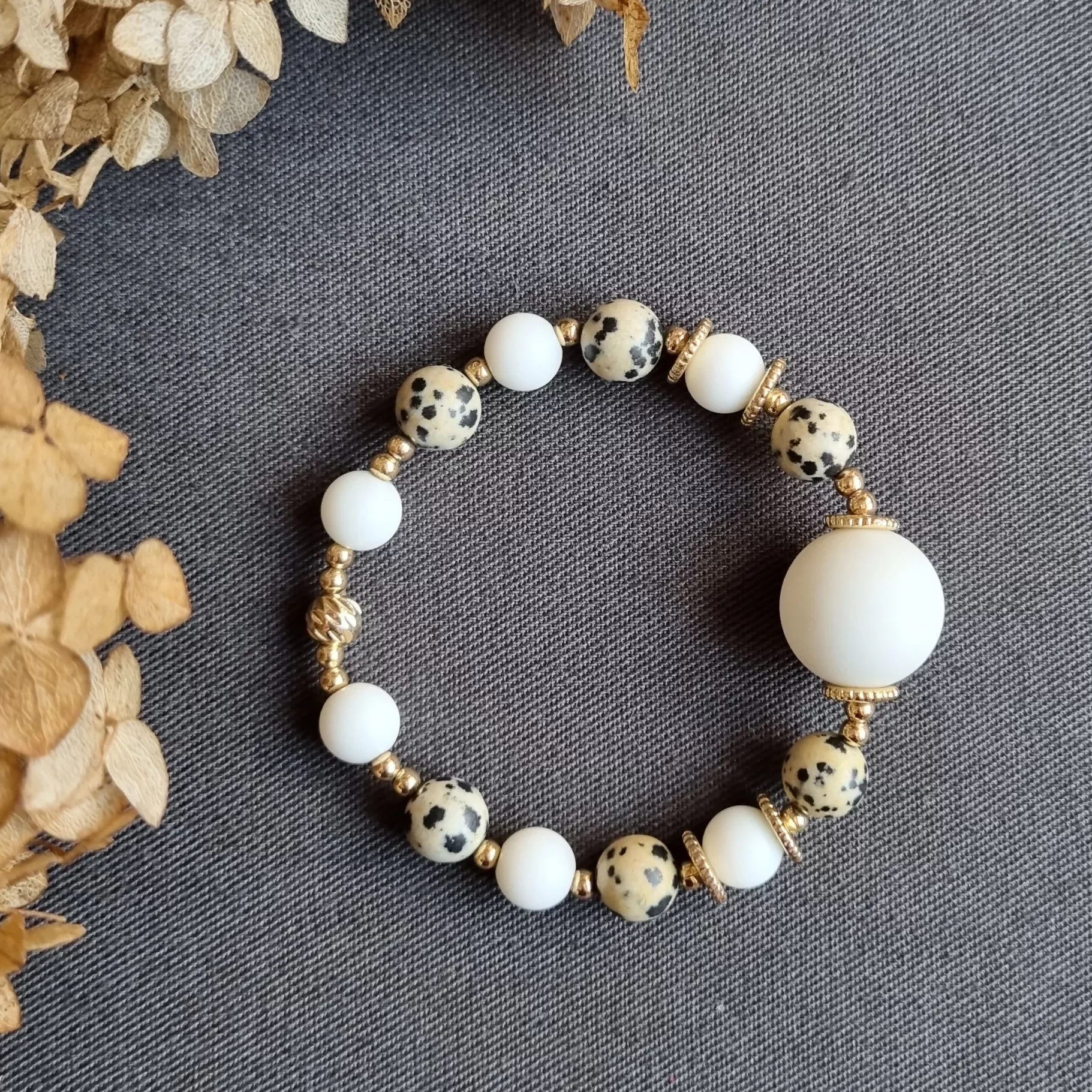 Элегантный браслет ручной работы «Далматин». Стрейч дизайн, бусины белого агата, яшма далматин, бусины лавы.