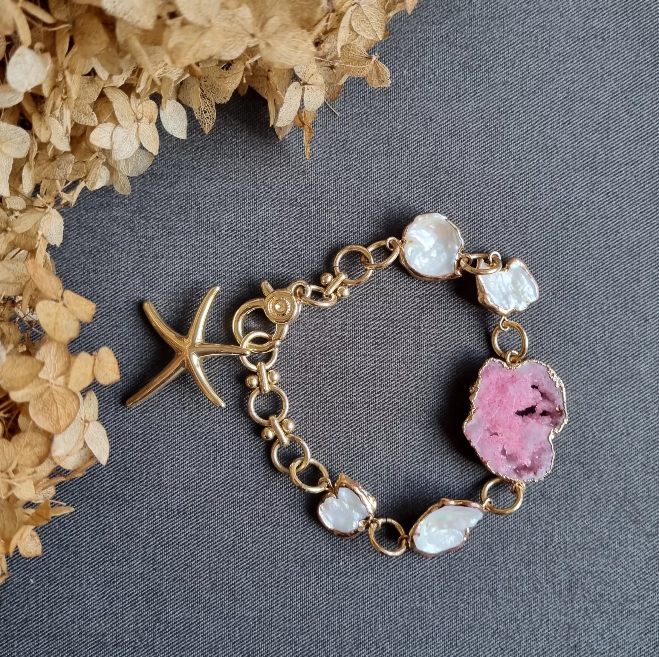 Браслет — цепь с друзой розового кварца, с добавлением жемчуга в патине — точно для Вас! Подвеска в виде морской звезды.